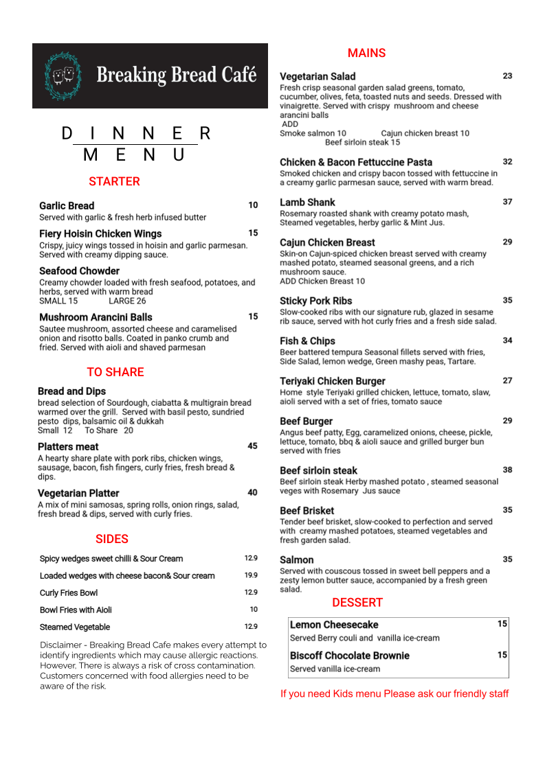 Welcome to Breaking Bread Cafe and Eatery, a delightful culinary gem located at 2 Newcastle Street, Ngāruawāhia. This cafe promises a warm and inviting atmosphere, ideal for a meal any time of day. The menu offers a range of enticing dishes, from the savory Garlic Bread at NZ$10 to scrumptious Fiery Hoisin Chicken Wings for NZ$15. Seafood lovers will relish the rich Seafood Chowder, while vegetarian patrons can enjoy delightful Mushroom Arancini Balls. A host of non-alcoholic drinks complements the food perfectly, with refreshing options like Bundles Ginger Beer and classic Orange Juice.
